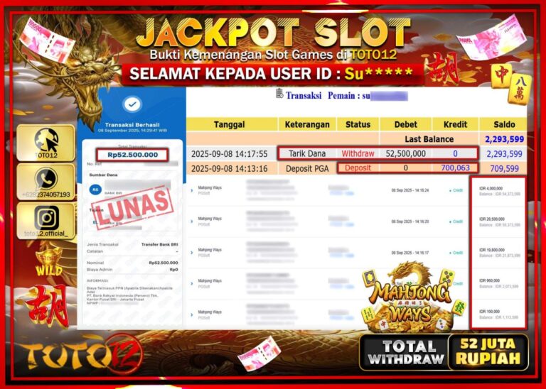 Selamat kepada Member Kami Su****** Telah Jackpot dan berhasil mendapatkan kemenangan besar pada permainan JACKPOT SLOT GAME (MAHJONG WAYS) Dengan Kemenangan Sebesar Rp.52.500.000 –. Setelah mengisi Fomulir Withdraw dengan Kurang waktu 1-2 Menit Dana sudah kami Trasnfer kepada Pemilik Userid dan dana sudah dapat di cairkan oleh pemenang. Bukti Pembayaran yang TOTO12 berikan merupakan Bukti Pembayaran…