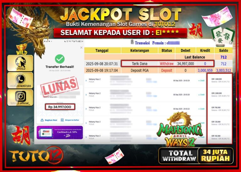 Selamat kepada Member Kami El****** Telah Jackpot dan berhasil mendapatkan kemenangan besar pada permainan JACKPOT SLOT GAME (MAHJONG WAYS 2) Dengan Kemenangan Sebesar Rp.34.997.000 –. Setelah mengisi Fomulir Withdraw dengan Kurang waktu 1-2 Menit Dana sudah kami Trasnfer kepada Pemilik Userid dan dana sudah dapat di cairkan oleh pemenang. Bukti Pembayaran yang TOTO12 berikan merupakan Bukti…