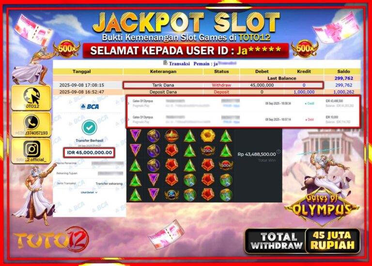 Selamat kepada Member Kami Ja****** Telah Jackpot dan berhasil mendapatkan kemenangan besar pada permainan JACKPOT SLOT GAME (GATES OF OLYMPUS) Dengan Kemenangan Sebesar Rp.45.000.000 –. Setelah mengisi Fomulir Withdraw dengan Kurang waktu 1-2 Menit Dana sudah kami Trasnfer kepada Pemilik Userid dan dana sudah dapat di cairkan oleh pemenang. Bukti Pembayaran yang TOTO12 berikan merupakan Bukti…