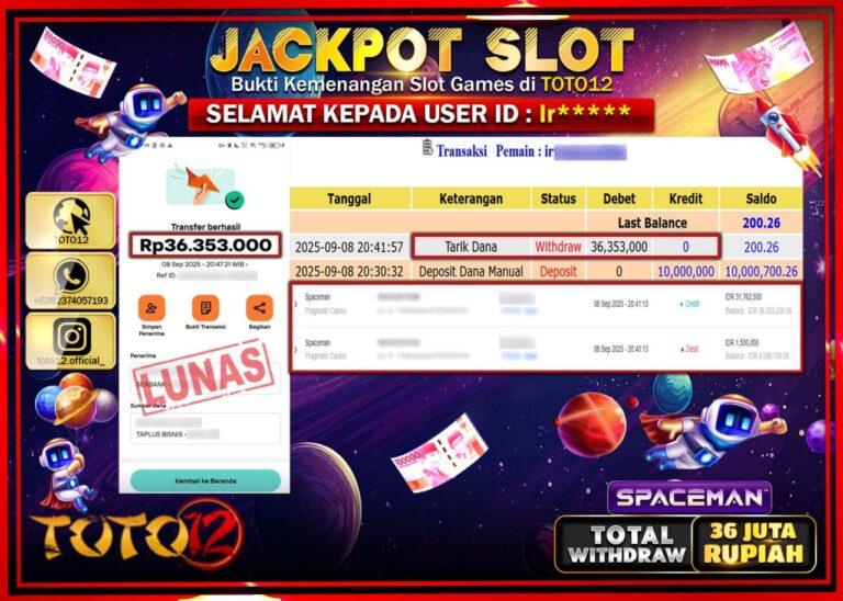 Selamat kepada Member Kami Ir****** Telah Jackpot dan berhasil mendapatkan kemenangan besar pada permainan JACKPOT SLOT GAME (SPACEMAN) Dengan Kemenangan Sebesar Rp.36.353.000 –. Setelah mengisi Fomulir Withdraw dengan Kurang waktu 1-2 Menit Dana sudah kami Trasnfer kepada Pemilik Userid dan dana sudah dapat di cairkan oleh pemenang. Bukti Pembayaran yang TOTO12 berikan merupakan Bukti Pembayaran yang …
