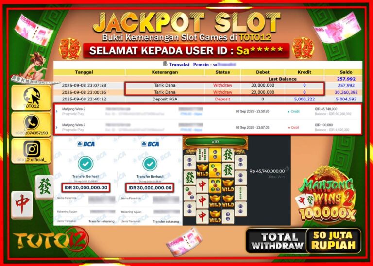 Selamat kepada Member Kami Sa****** Telah Jackpot dan berhasil mendapatkan kemenangan besar pada permainan JACKPOT SLOT GAME (MAHJONG WINS 2) Dengan Kemenangan Sebesar Rp.50.000.000 –. Setelah mengisi Fomulir Withdraw dengan Kurang waktu 1-2 Menit Dana sudah kami Trasnfer kepada Pemilik Userid dan dana sudah dapat di cairkan oleh pemenang. Bukti Pembayaran yang TOTO12 berikan merupakan Bukti…