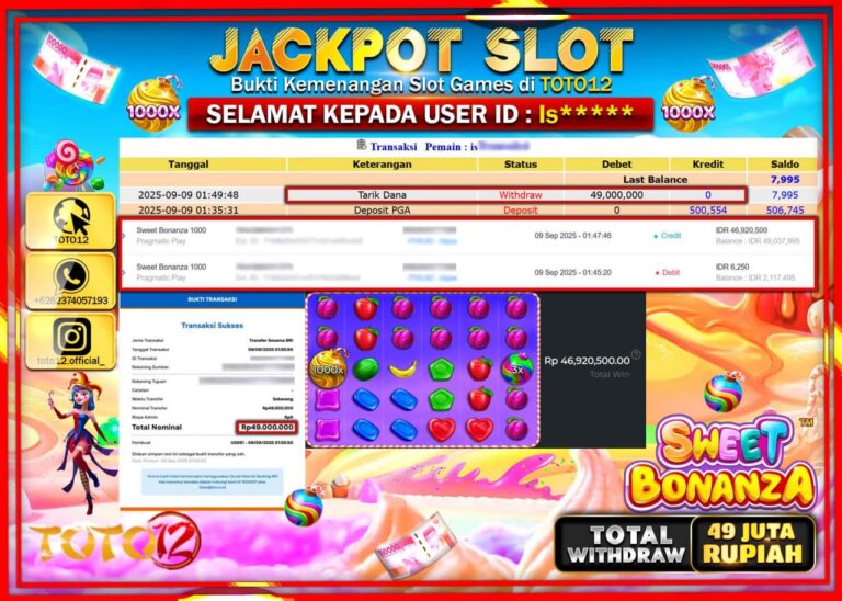 Selamat kepada Member Kami Is****** Telah Jackpot dan berhasil mendapatkan kemenangan besar pada permainan JACKPOT SLOT GAME (SWEET BONANZA) Dengan Kemenangan Sebesar Rp.49.000.000 –. Setelah mengisi Fomulir Withdraw dengan Kurang waktu 1-2 Menit Dana sudah kami Trasnfer kepada Pemilik Userid dan dana sudah dapat di cairkan oleh pemenang. Bukti Pembayaran yang TOTO12 berikan merupakan Bukti Pembayaran…