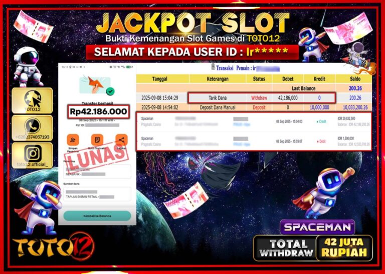 Selamat kepada Member Kami Ir****** Telah Jackpot dan berhasil mendapatkan kemenangan besar pada permainan JACKPOT SLOT GAME (SPACEMAN) Dengan Kemenangan Sebesar Rp.42.186.000 –. Setelah mengisi Fomulir Withdraw dengan Kurang waktu 1-2 Menit Dana sudah kami Trasnfer kepada Pemilik Userid dan dana sudah dapat di cairkan oleh pemenang. Bukti Pembayaran yang TOTO12 berikan merupakan Bukti Pembayaran yang …