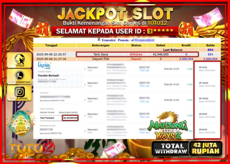 Selamat kepada Member Kami El****** Telah Jackpot dan berhasil mendapatkan kemenangan besar pada permainan JACKPOT SLOT GAME (MAHJONG WAYS 2) Dengan Kemenangan Sebesar Rp.42.948.000 –. Setelah mengisi Fomulir Withdraw dengan Kurang waktu 1-2 Menit Dana sudah kami Trasnfer kepada Pemilik Userid dan dana sudah dapat di cairkan oleh pemenang. Bukti Pembayaran yang TOTO12 berikan merupakan Bukti…