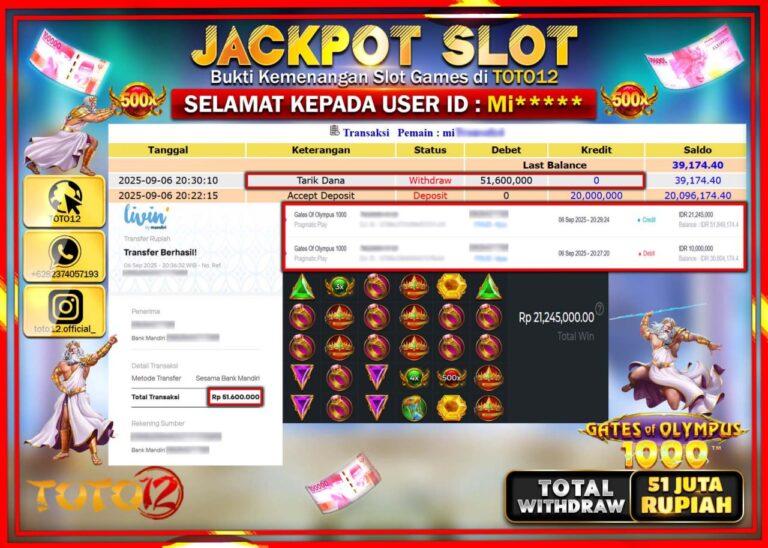 Selamat kepada Member Kami Al****** Telah Jackpot dan berhasil mendapatkan kemenangan besar pada permainan JACKPOT SLOT GAME (GATES OF OLYMPUS) Dengan Kemenangan Sebesar Rp.54.563.000 –. Setelah mengisi Fomulir Withdraw dengan Kurang waktu 1-2 Menit Dana sudah kami Trasnfer kepada Pemilik Userid dan dana sudah dapat di cairkan oleh pemenang. Bukti Pembayaran yang TOTO12 berikan merupakan Bukti…