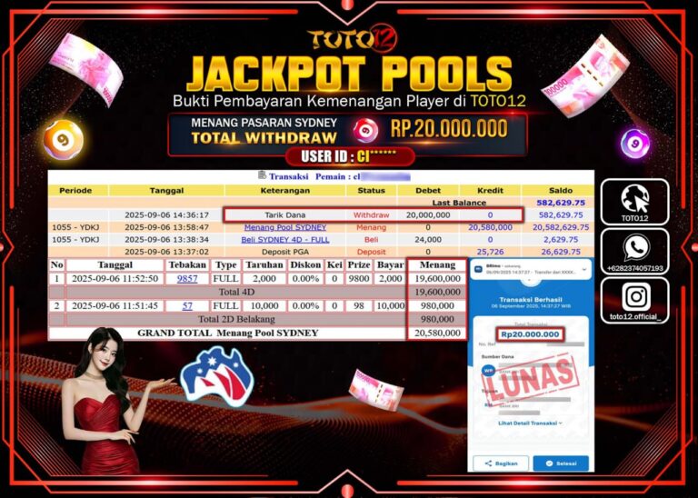 Selamat kepada Member Kami Cl****** Telah Jackpot dan berhasil mendapatkan kemenangan besar pada permainan JACKPOT POOLS PASARAN (SYDNEY) Dengan Kemenangan Sebesar Rp.20.000.000 –. Setelah mengisi Fomulir Withdraw dengan Kurang waktu 1-2 Menit Dana sudah kami Trasnfer kepada Pemilik Userid dan dana sudah dapat di cairkan oleh pemenang. Bukti Pembayaran yang TOTO12 berikan merupakan Bukti Pembayaran yang …