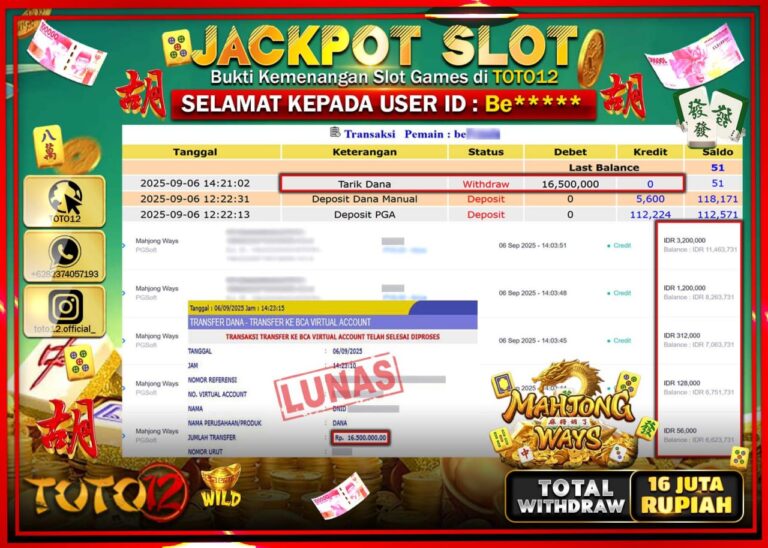 Selamat kepada Member Kami Be****** Telah Jackpot dan berhasil mendapatkan kemenangan besar pada permainan JACKPOT SLOT GAME (MAHJONG WAYS) Dengan Kemenangan Sebesar Rp.16.500.000 –. Setelah mengisi Fomulir Withdraw dengan Kurang waktu 1-2 Menit Dana sudah kami Trasnfer kepada Pemilik Userid dan dana sudah dapat di cairkan oleh pemenang. Bukti Pembayaran yang TOTO12 berikan merupakan Bukti Pembayaran…