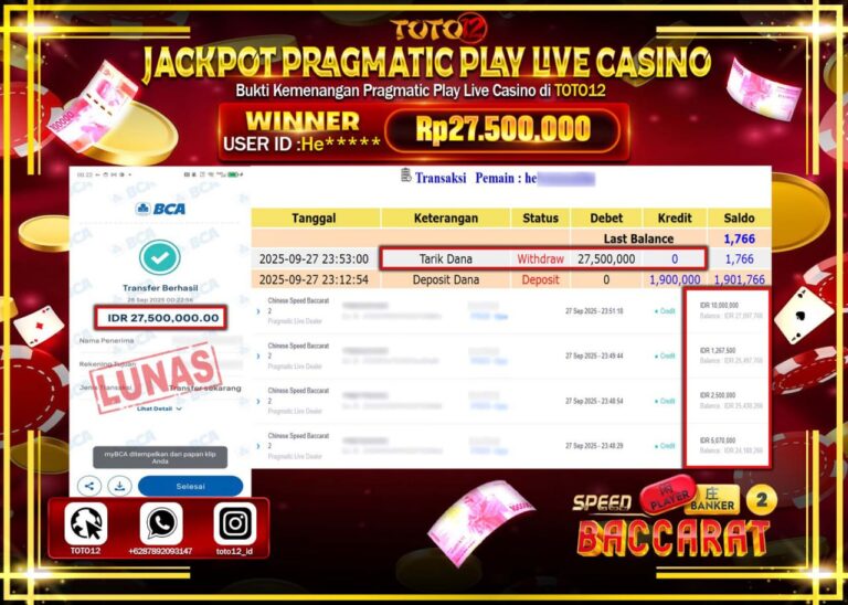 Selamat kepada Member Kami He****** Telah Jackpot dan berhasil mendapatkan kemenangan besar pada permainan JACKPOT PRAGMATIC PLAY LIVE CASINO (CHINESE SPEED BACCARAT 2) Dengan Kemenangan Sebesar Rp.27.500.000 –. Setelah mengisi Fomulir Withdraw dengan Kurang waktu 1-2 Menit Dana sudah kami Trasnfer kepada Pemilik Userid dan dana sudah dapat di cairkan oleh pemenang. Bukti Pembayaran yang TOTO12…