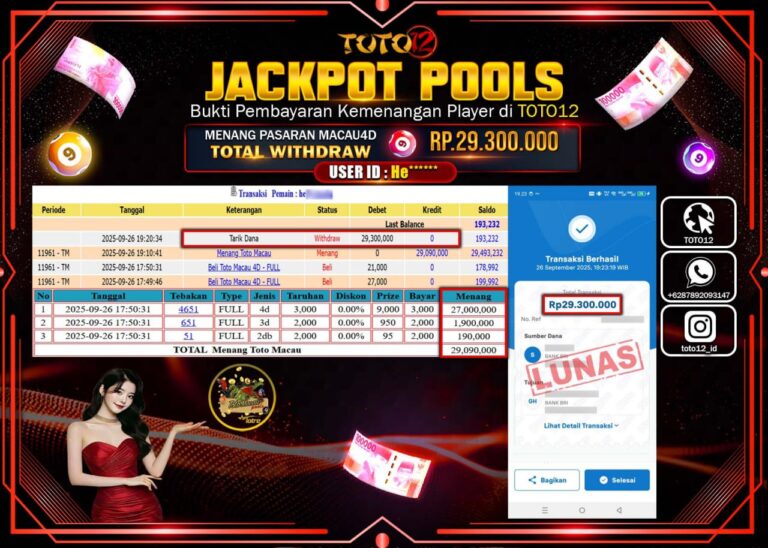 Selamat kepada Member Kami He****** Telah Jackpot dan berhasil mendapatkan kemenangan besar pada permainan JACKPOT POOLS PASARAN (MACAU 4D) Dengan Kemenangan Sebesar Rp.29.300.000 –. Setelah mengisi Fomulir Withdraw dengan Kurang waktu 1-2 Menit Dana sudah kami Trasnfer kepada Pemilik Userid dan dana sudah dapat di cairkan oleh pemenang. Bukti Pembayaran yang TOTO12 berikan merupakan Bukti Pembayaran…