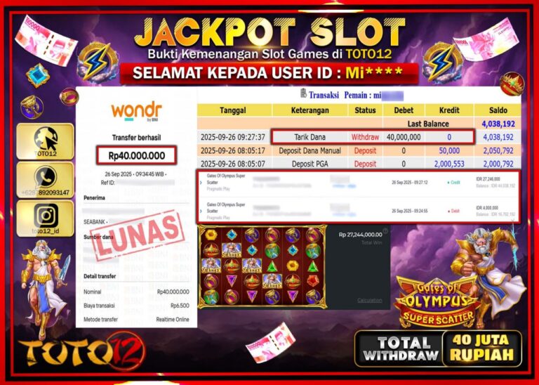 Selamat kepada Member Kami Mi****** Telah Jackpot dan berhasil mendapatkan kemenangan besar pada permainan JACKPOT SLOT GAME (GATES OF OLYMPUS SUPER SCATTER) Dengan Kemenangan Sebesar Rp.40.000.000 –. Setelah mengisi Fomulir Withdraw dengan Kurang waktu 1-2 Menit Dana sudah kami Trasnfer kepada Pemilik Userid dan dana sudah dapat di cairkan oleh pemenang. Bukti Pembayaran yang TOTO12 berikan…