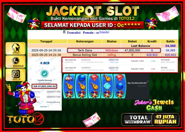Selamat kepada Member Kami Oc****** Telah Jackpot dan berhasil mendapatkan kemenangan besar pada permainan JACKPOT SLOT GAME (JOKERS JEWELS CASH) Dengan Kemenangan Sebesar Rp.47.800.000 –. Setelah mengisi Fomulir Withdraw dengan Kurang waktu 1-2 Menit Dana sudah kami Trasnfer kepada Pemilik Userid dan dana sudah dapat di cairkan oleh pemenang. Bukti Pembayaran yang TOTO12 berikan merupakan Bukti…