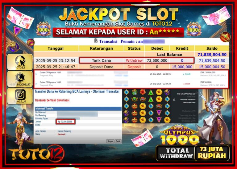 Selamat kepada Member Kami An****** Telah Jackpot dan berhasil mendapatkan kemenangan besar pada permainan JACKPOT SLOT GAME (GATES OF OLYMPUS 1000) Dengan Kemenangan Sebesar Rp.73.500.000 –. Setelah mengisi Fomulir Withdraw dengan Kurang waktu 1-2 Menit Dana sudah kami Trasnfer kepada Pemilik Userid dan dana sudah dapat di cairkan oleh pemenang. Bukti Pembayaran yang TOTO12 berikan merupakan…