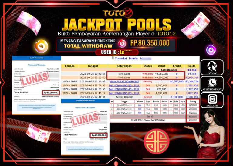 Selamat kepada Member Kami Le****** Telah Jackpot dan berhasil mendapatkan kemenangan besar pada permainan JACKPOT POOLS PASARAN (HONGKONG) Dengan Kemenangan Sebesar Rp.80.350.000 –. Setelah mengisi Fomulir Withdraw dengan Kurang waktu 1-2 Menit Dana sudah kami Trasnfer kepada Pemilik Userid dan dana sudah dapat di cairkan oleh pemenang. Bukti Pembayaran yang TOTO12 berikan merupakan Bukti Pembayaran yang …