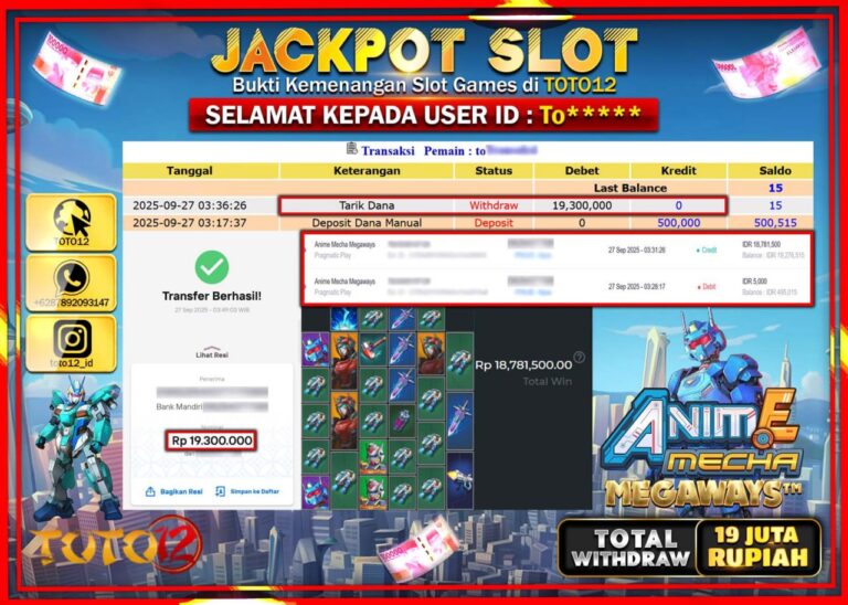 Selamat kepada Member Kami To****** Telah Jackpot dan berhasil mendapatkan kemenangan besar pada permainan JACKPOT SLOT GAME (ANIME MECHA MEGAWAYS) Dengan Kemenangan Sebesar Rp.19.300.000 –. Setelah mengisi Fomulir Withdraw dengan Kurang waktu 1-2 Menit Dana sudah kami Trasnfer kepada Pemilik Userid dan dana sudah dapat di cairkan oleh pemenang. Bukti Pembayaran yang TOTO12 berikan merupakan Bukti…