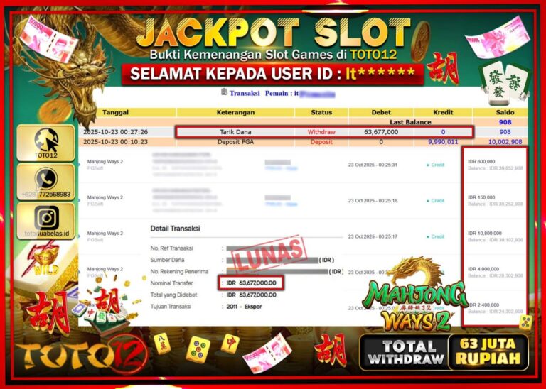 Selamat kepada Member Kami It****** Telah Jackpot dan berhasil mendapatkan kemenangan besar pada permainan JACKPOT SLOT GAME (MAHJONG WAYS 2) Dengan Kemenangan Sebesar Rp.63.677.000 –. Setelah mengisi Fomulir Withdraw dengan Kurang waktu 1-2 Menit Dana sudah kami Trasnfer kepada Pemilik Userid dan dana sudah dapat di cairkan oleh pemenang. Bukti Pembayaran yang TOTO12 berikan merupakan Bukti…