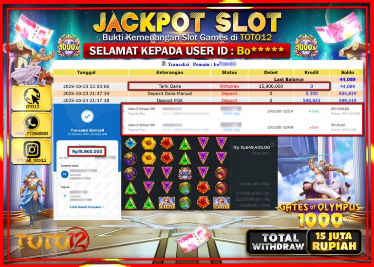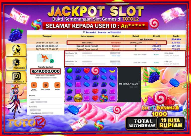 Selamat kepada Member Kami An****** Telah Jackpot dan berhasil mendapatkan kemenangan besar pada permainan JACKPOT SLOT GAME (SWEET BONANZA 1000) Dengan Kemenangan Sebesar Rp.19.000.000 –. Setelah mengisi Fomulir Withdraw dengan Kurang waktu 1-2 Menit Dana sudah kami Trasnfer kepada Pemilik Userid dan dana sudah dapat di cairkan oleh pemenang. Bukti Pembayaran yang TOTO12 berikan merupakan Bukti…