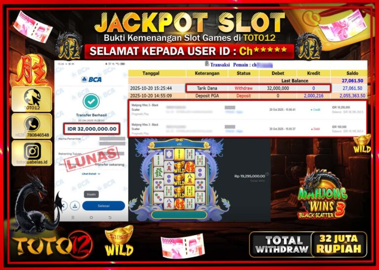 Selamat kepada Member Kami Ch****** Telah Jackpot dan berhasil mendapatkan kemenangan besar pada permainan JACKPOT SLOT GAME (MAHJONG WINS 3 BLACK SCATTER) Dengan Kemenangan Sebesar Rp.32.000.000 –. Setelah mengisi Fomulir Withdraw dengan Kurang waktu 1-2 Menit Dana sudah kami Trasnfer kepada Pemilik Userid dan dana sudah dapat di cairkan oleh pemenang. Bukti Pembayaran yang TOTO12 berikan…