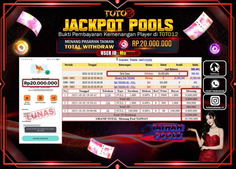 Selamat kepada Member Kami Mu****** Telah Jackpot dan berhasil mendapatkan kemenangan besar pada permainan JACKPOT POOLS PASARAN (TAIWAN) Dengan Kemenangan Sebesar Rp.20.000.000 –. Setelah mengisi Fomulir Withdraw dengan Kurang waktu 1-2 Menit Dana sudah kami Trasnfer kepada Pemilik Userid dan dana sudah dapat di cairkan oleh pemenang. Bukti Pembayaran yang TOTO12 berikan merupakan Bukti Pembayaran yang …