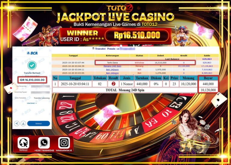 Selamat kepada Member Kami As****** Telah Jackpot dan berhasil mendapatkan kemenangan besar pada permainan JACKPOT LIVE CASINO (24D SPIN) Dengan Kemenangan Sebesar Rp.16.510.000 –. Setelah mengisi Fomulir Withdraw dengan Kurang waktu 1-2 Menit Dana sudah kami Trasnfer kepada Pemilik Userid dan dana sudah dapat di cairkan oleh pemenang. Bukti Pembayaran yang TOTO12 berikan merupakan Bukti Pembayaran…