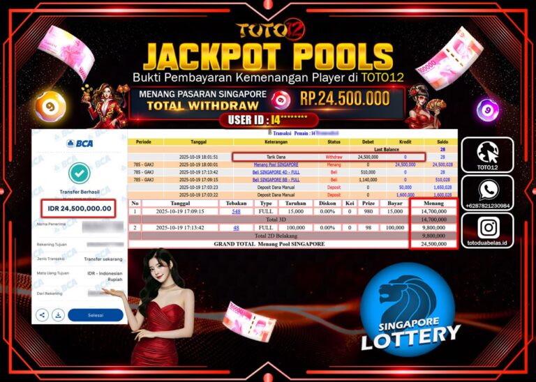 Selamat kepada Member Kami L4****** Telah Jackpot dan berhasil mendapatkan kemenangan besar pada permainan JACKPOT POOLS PASARAN (SINGAPORE) Dengan Kemenangan Sebesar Rp.24.500.000 –. Setelah mengisi Fomulir Withdraw dengan Kurang waktu 1-2 Menit Dana sudah kami Trasnfer kepada Pemilik Userid dan dana sudah dapat di cairkan oleh pemenang. Bukti Pembayaran yang TOTO12 berikan merupakan Bukti Pembayaran yang …