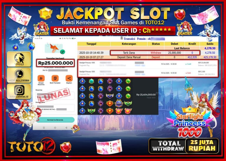 Selamat kepada Member Kami Ch****** Telah Jackpot dan berhasil mendapatkan kemenangan besar pada permainan JACKPOT SLOT GAME (STARLIGHT PRINCESS 1000) Dengan Kemenangan Sebesar Rp.25.000.000 –. Setelah mengisi Fomulir Withdraw dengan Kurang waktu 1-2 Menit Dana sudah kami Trasnfer kepada Pemilik Userid dan dana sudah dapat di cairkan oleh pemenang. Bukti Pembayaran yang TOTO12 berikan merupakan Bukti…