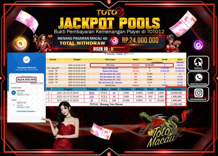 Selamat kepada Member Kami Li****** Telah Jackpot dan berhasil mendapatkan kemenangan besar pada permainan JACKPOT POOLS PASARAN (MACAU 4D) Dengan Kemenangan Sebesar Rp.24.000.000 –. Setelah mengisi Fomulir Withdraw dengan Kurang waktu 1-2 Menit Dana sudah kami Trasnfer kepada Pemilik Userid dan dana sudah dapat di cairkan oleh pemenang. Bukti Pembayaran yang TOTO12 berikan merupakan Bukti Pembayaran…