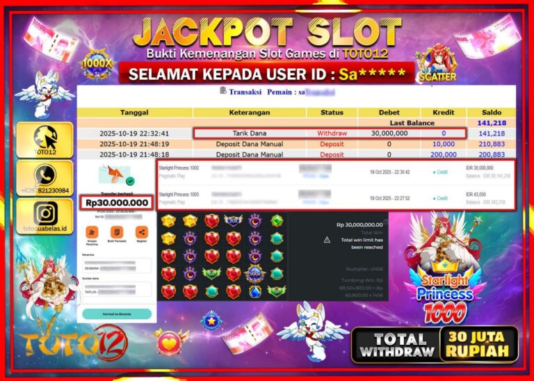 Selamat kepada Member Kami Sa****** Telah Jackpot dan berhasil mendapatkan kemenangan besar pada permainan JACKPOT SLOT GAME (STARLIGHT PRINCESS 1000) Dengan Kemenangan Sebesar Rp.30.000.000 –. Setelah mengisi Fomulir Withdraw dengan Kurang waktu 1-2 Menit Dana sudah kami Trasnfer kepada Pemilik Userid dan dana sudah dapat di cairkan oleh pemenang. Bukti Pembayaran yang TOTO12 berikan merupakan Bukti…