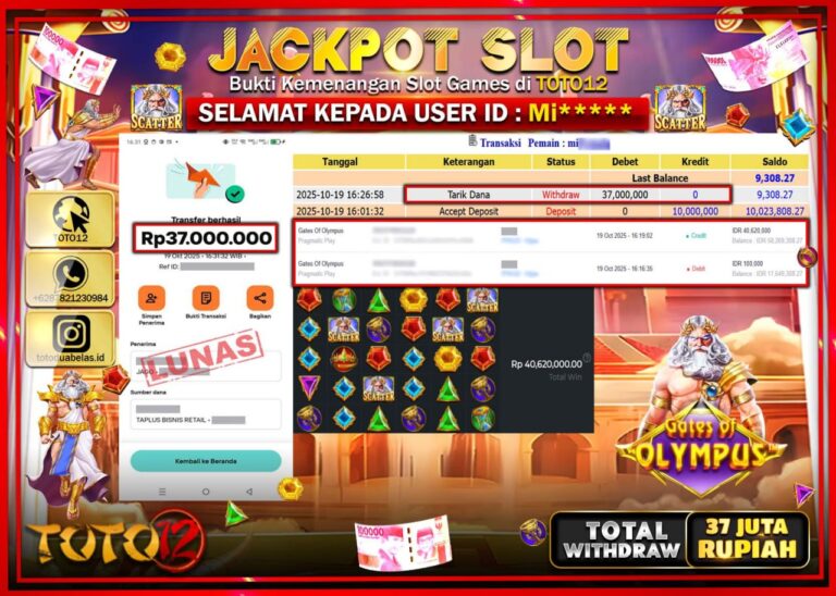 Selamat kepada Member Kami Mi****** Telah Jackpot dan berhasil mendapatkan kemenangan besar pada permainan JACKPOT SLOT GAME (GATES OF OLYMPUS) Dengan Kemenangan Sebesar Rp.37.000.000 –. Setelah mengisi Fomulir Withdraw dengan Kurang waktu 1-2 Menit Dana sudah kami Trasnfer kepada Pemilik Userid dan dana sudah dapat di cairkan oleh pemenang. Bukti Pembayaran yang TOTO12 berikan merupakan Bukti…