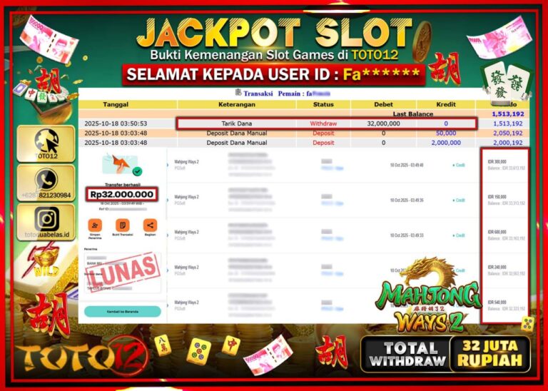 Selamat kepada Member Kami Fa****** Telah Jackpot dan berhasil mendapatkan kemenangan besar pada permainan JACKPOT SLOT GAME (MAHJONG WAYS 2) Dengan Kemenangan Sebesar Rp.32.000.000 –. Setelah mengisi Fomulir Withdraw dengan Kurang waktu 1-2 Menit Dana sudah kami Trasnfer kepada Pemilik Userid dan dana sudah dapat di cairkan oleh pemenang. Bukti Pembayaran yang TOTO12 berikan merupakan Bukti…