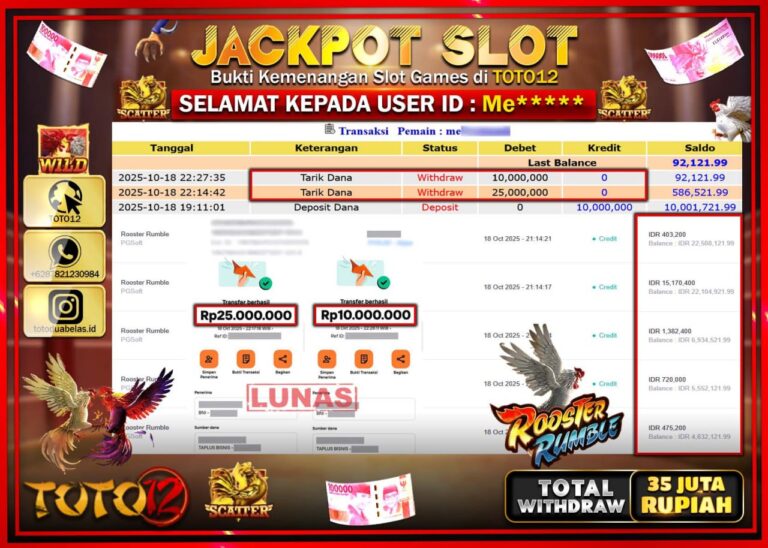 Selamat kepada Member Kami Me****** Telah Jackpot dan berhasil mendapatkan kemenangan besar pada permainan JACKPOT SLOT GAME (ROOSTER RUMBLE) Dengan Kemenangan Sebesar Rp.35.000.000 –. Setelah mengisi Fomulir Withdraw dengan Kurang waktu 1-2 Menit Dana sudah kami Trasnfer kepada Pemilik Userid dan dana sudah dapat di cairkan oleh pemenang. Bukti Pembayaran yang TOTO12 berikan merupakan Bukti Pembayaran…