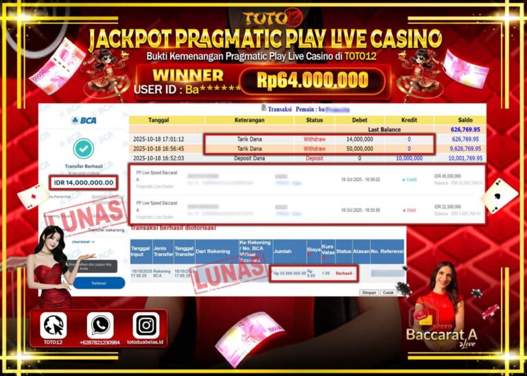 Selamat kepada Member Kami Ba****** Telah Jackpot dan berhasil mendapatkan kemenangan besar pada permainan JACKPOT PRAGMATIC PLAY LIVE CASINO (LIVE SPEED BACCARAT) Dengan Kemenangan Sebesar Rp.64.000.000 –. Setelah mengisi Fomulir Withdraw dengan Kurang waktu 1-2 Menit Dana sudah kami Trasnfer kepada Pemilik Userid dan dana sudah dapat di cairkan oleh pemenang. Bukti Pembayaran yang TOTO12 berikan…