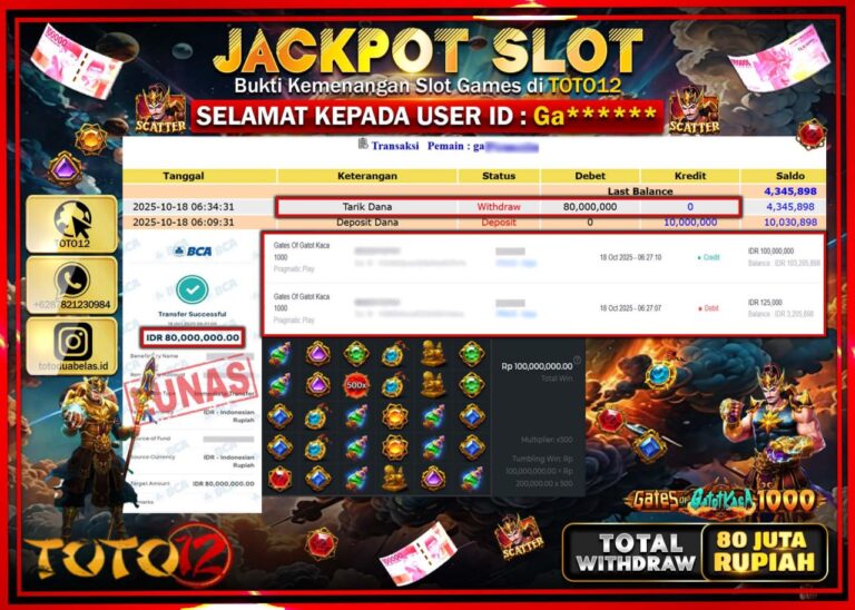 Selamat kepada Member Kami Ga****** Telah Jackpot dan berhasil mendapatkan kemenangan besar pada permainan JACKPOT SLOT GAME (GATES OF GATOT KACA 1000) Dengan Kemenangan Sebesar Rp.80.000.000 –. Setelah mengisi Fomulir Withdraw dengan Kurang waktu 1-2 Menit Dana sudah kami Trasnfer kepada Pemilik Userid dan dana sudah dapat di cairkan oleh pemenang. Bukti Pembayaran yang TOTO12 berikan…