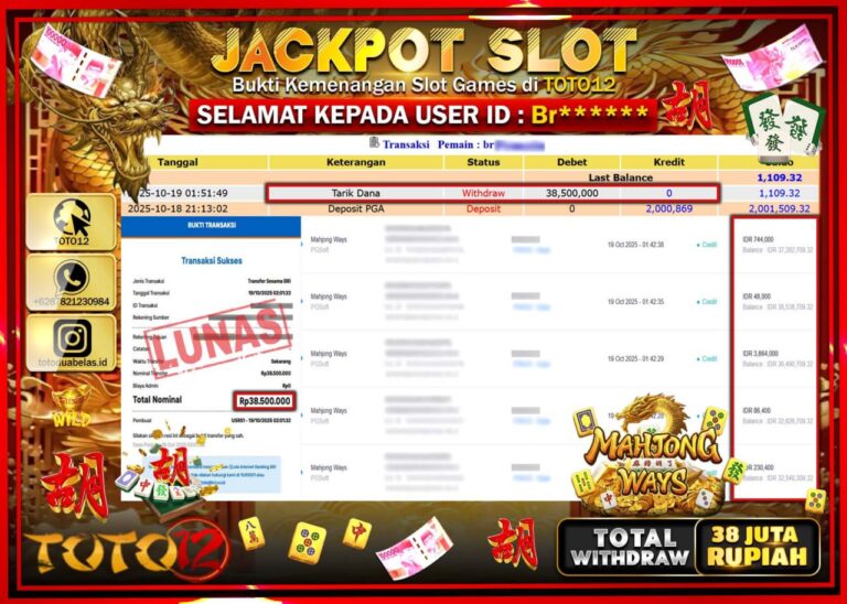 Selamat kepada Member Kami Br****** Telah Jackpot dan berhasil mendapatkan kemenangan besar pada permainan JACKPOT SLOT GAME (MAHJONG WAYS) Dengan Kemenangan Sebesar Rp.38.500.000 –. Setelah mengisi Fomulir Withdraw dengan Kurang waktu 1-2 Menit Dana sudah kami Trasnfer kepada Pemilik Userid dan dana sudah dapat di cairkan oleh pemenang. Bukti Pembayaran yang TOTO12 berikan merupakan Bukti Pembayaran…