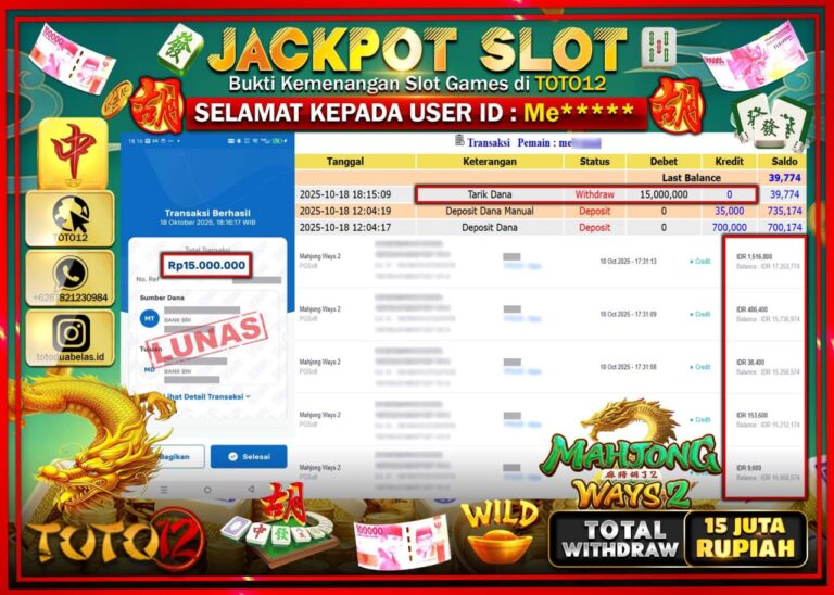 Selamat kepada Member Kami Me****** Telah Jackpot dan berhasil mendapatkan kemenangan besar pada permainan JACKPOT SLOT GAME (MAHJONG WAYS 2) Dengan Kemenangan Sebesar Rp.15.000.000 –. Setelah mengisi Fomulir Withdraw dengan Kurang waktu 1-2 Menit Dana sudah kami Trasnfer kepada Pemilik Userid dan dana sudah dapat di cairkan oleh pemenang. Bukti Pembayaran yang TOTO12 berikan merupakan Bukti…
