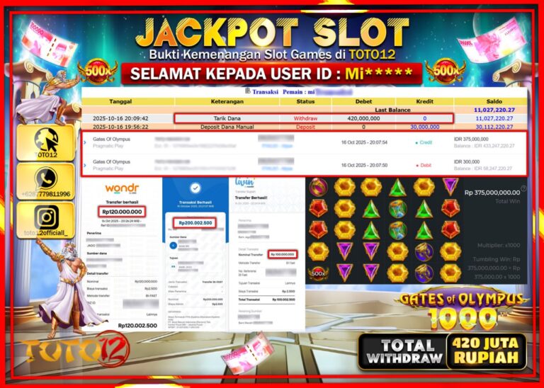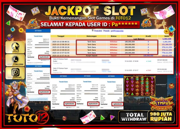 Selamat kepada Member Kami Pa****** Telah Jackpot dan berhasil mendapatkan kemenangan besar pada permainan JACKPOT SLOT GAME (GATES OF OLYMPUS SUPER SCATTER) Dengan Kemenangan Sebesar Rp.980.000.000 –. Setelah mengisi Fomulir Withdraw dengan Kurang waktu 1-2 Menit Dana sudah kami Trasnfer kepada Pemilik Userid dan dana sudah dapat di cairkan oleh pemenang. Bukti Pembayaran yang TOTO12 berikan…