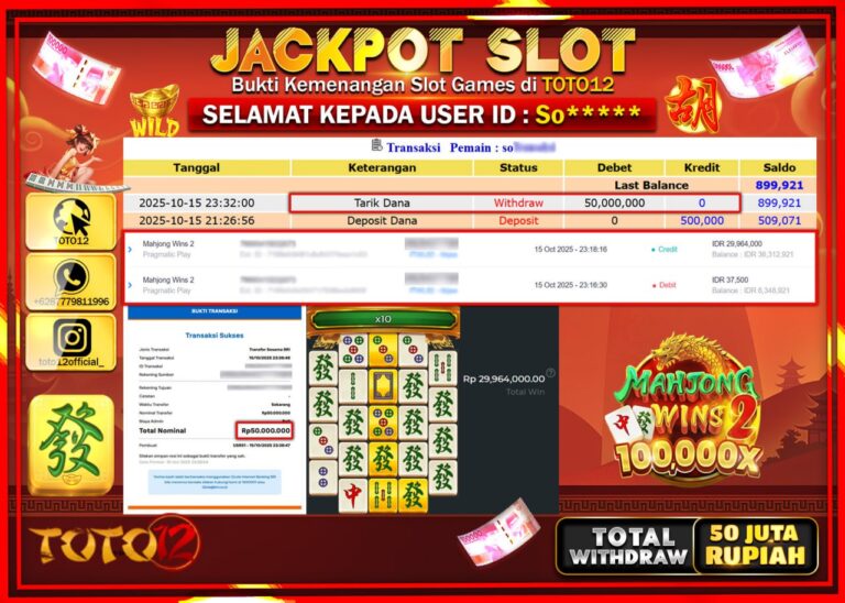 Selamat kepada Member Kami So****** Telah Jackpot dan berhasil mendapatkan kemenangan besar pada permainan JACKPOT SLOT GAME (MAHJONG WINS 2) Dengan Kemenangan Sebesar Rp.50.000.000 –. Setelah mengisi Fomulir Withdraw dengan Kurang waktu 1-2 Menit Dana sudah kami Trasnfer kepada Pemilik Userid dan dana sudah dapat di cairkan oleh pemenang. Bukti Pembayaran yang TOTO12 berikan merupakan Bukti…