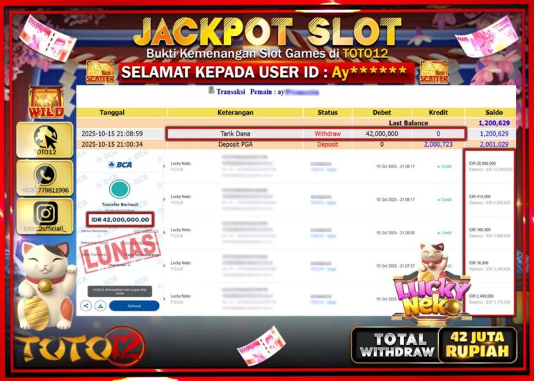 HANYA DI TOTO12 JP PASTI DI BAYAR LUNAS DAN CEPAT!!!!!! JACKPOT SLOT GAME (LUCKY NEKO) Rp.42.000.000 !!!!