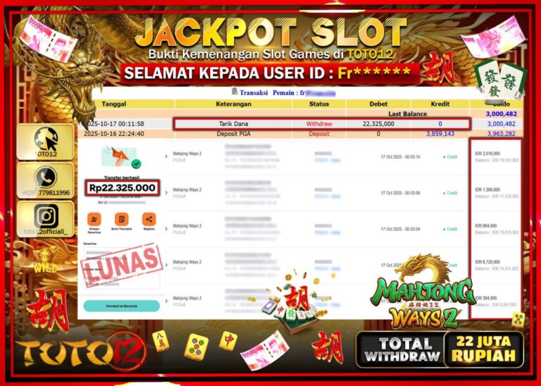 Selamat kepada Member Kami Fr****** Telah Jackpot dan berhasil mendapatkan kemenangan besar pada permainan JACKPOT SLOT GAME (MAHJONG WAYS 2) Dengan Kemenangan Sebesar Rp.22.325.000 –. Setelah mengisi Fomulir Withdraw dengan Kurang waktu 1-2 Menit Dana sudah kami Trasnfer kepada Pemilik Userid dan dana sudah dapat di cairkan oleh pemenang. Bukti Pembayaran yang TOTO12 berikan merupakan Bukti…