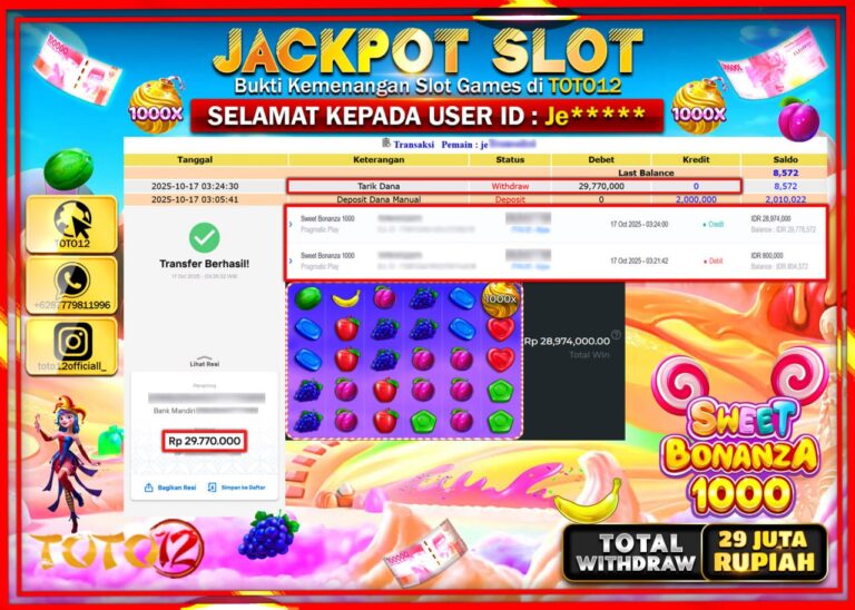 Selamat kepada Member Kami Je****** Telah Jackpot dan berhasil mendapatkan kemenangan besar pada permainan JACKPOT SLOT GAME (SWEET BONANZA 1000) Dengan Kemenangan Sebesar Rp.29.770.000 –. Setelah mengisi Fomulir Withdraw dengan Kurang waktu 1-2 Menit Dana sudah kami Trasnfer kepada Pemilik Userid dan dana sudah dapat di cairkan oleh pemenang. Bukti Pembayaran yang TOTO12 berikan merupakan Bukti…
