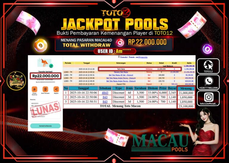 Selamat kepada Member Kami Am****** Telah Jackpot dan berhasil mendapatkan kemenangan besar pada permainan JACKPOT POOLS PASARAN (MACAU 4D) Dengan Kemenangan Sebesar Rp.22.000.000 –. Setelah mengisi Fomulir Withdraw dengan Kurang waktu 1-2 Menit Dana sudah kami Trasnfer kepada Pemilik Userid dan dana sudah dapat di cairkan oleh pemenang. Bukti Pembayaran yang TOTO12 berikan merupakan Bukti Pembayaran…