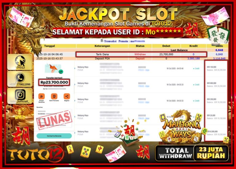 Selamat kepada Member Kami Mo****** Telah Jackpot dan berhasil mendapatkan kemenangan besar pada permainan JACKPOT SLOT GAME (MAHJONG WAYS) Dengan Kemenangan Sebesar Rp.23.700.000 –. Setelah mengisi Fomulir Withdraw dengan Kurang waktu 1-2 Menit Dana sudah kami Trasnfer kepada Pemilik Userid dan dana sudah dapat di cairkan oleh pemenang. Bukti Pembayaran yang TOTO12 berikan merupakan Bukti Pembayaran…