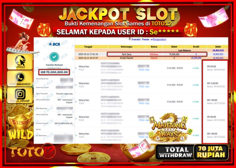 Selamat kepada Member Kami Se****** Telah Jackpot dan berhasil mendapatkan kemenangan besar pada permainan JACKPOT SLOT GAME (MAHJONG WAYS) Dengan Kemenangan Sebesar Rp.70.000.000 –. Setelah mengisi Fomulir Withdraw dengan Kurang waktu 1-2 Menit Dana sudah kami Trasnfer kepada Pemilik Userid dan dana sudah dapat di cairkan oleh pemenang. Bukti Pembayaran yang TOTO12 berikan merupakan Bukti Pembayaran…