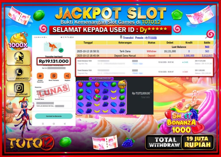 Selamat kepada Member Kami Dy****** Telah Jackpot dan berhasil mendapatkan kemenangan besar pada permainan JACKPOT SLOT GAME (SWEET BONANZA 1000) Dengan Kemenangan Sebesar Rp.19.131.000 –. Setelah mengisi Fomulir Withdraw dengan Kurang waktu 1-2 Menit Dana sudah kami Trasnfer kepada Pemilik Userid dan dana sudah dapat di cairkan oleh pemenang. Bukti Pembayaran yang TOTO12 berikan merupakan Bukti…