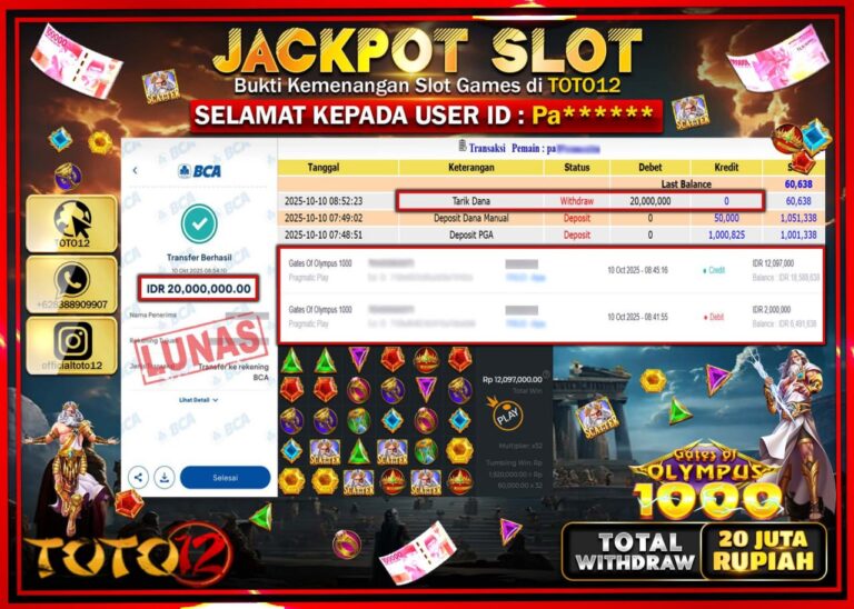 Selamat kepada Member Kami Pa****** Telah Jackpot dan berhasil mendapatkan kemenangan besar pada permainan JACKPOT SLOT GAME (GATES OF OLYMPUS 1000) Dengan Kemenangan Sebesar Rp.20.000.000 –. Setelah mengisi Fomulir Withdraw dengan Kurang waktu 1-2 Menit Dana sudah kami Trasnfer kepada Pemilik Userid dan dana sudah dapat di cairkan oleh pemenang. Bukti Pembayaran yang TOTO12 berikan merupakan…