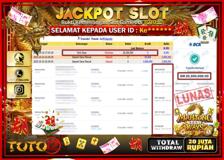 Selamat kepada Member Kami Ke****** Telah Jackpot dan berhasil mendapatkan kemenangan besar pada permainan JACKPOT SLOT GAME (MAHJONG WAYS) Dengan Kemenangan Sebesar Rp.20.300.000 –. Setelah mengisi Fomulir Withdraw dengan Kurang waktu 1-2 Menit Dana sudah kami Trasnfer kepada Pemilik Userid dan dana sudah dapat di cairkan oleh pemenang. Bukti Pembayaran yang TOTO12 berikan merupakan Bukti Pembayaran…