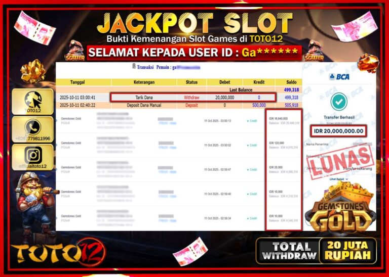 Selamat kepada Member Kami Ga****** Telah Jackpot dan berhasil mendapatkan kemenangan besar pada permainan JACKPOT SLOT GAME (GEMSTONES GOLD) Dengan Kemenangan Sebesar Rp.20.000.000 –. Setelah mengisi Fomulir Withdraw dengan Kurang waktu 1-2 Menit Dana sudah kami Trasnfer kepada Pemilik Userid dan dana sudah dapat di cairkan oleh pemenang. Bukti Pembayaran yang TOTO12 berikan merupakan Bukti Pembayaran…