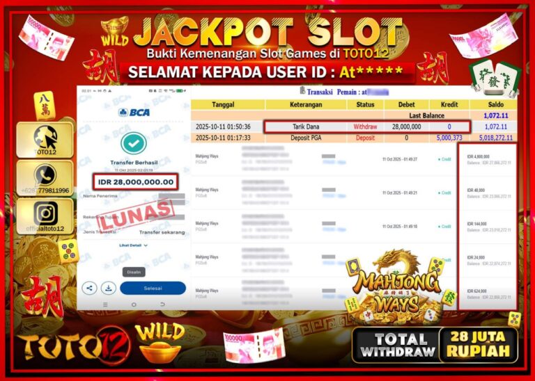 Selamat kepada Member Kami At****** Telah Jackpot dan berhasil mendapatkan kemenangan besar pada permainan JACKPOT SLOT GAME (MAHJONG WAYS) Dengan Kemenangan Sebesar Rp.28.000.000 –. Setelah mengisi Fomulir Withdraw dengan Kurang waktu 1-2 Menit Dana sudah kami Trasnfer kepada Pemilik Userid dan dana sudah dapat di cairkan oleh pemenang. Bukti Pembayaran yang TOTO12 berikan merupakan Bukti Pembayaran…