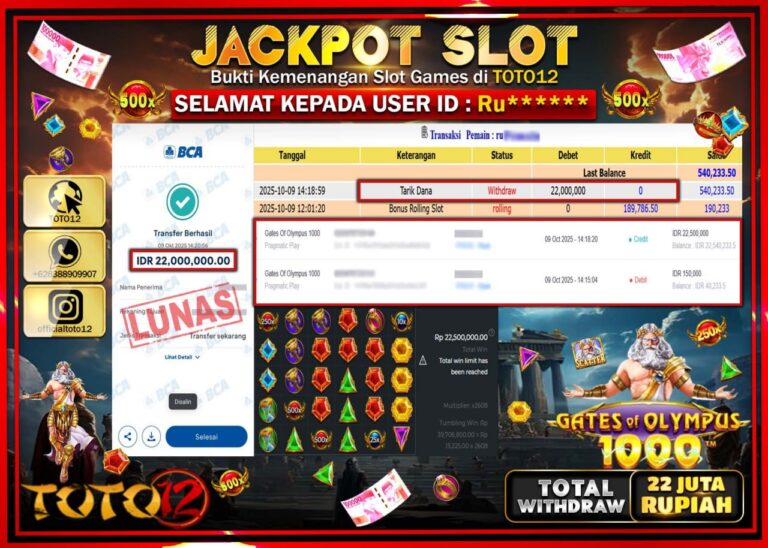 Selamat kepada Member Kami Ru****** Telah Jackpot dan berhasil mendapatkan kemenangan besar pada permainan JACKPOT SLOT GAME (GATES OF OLYMPUS 1000) Dengan Kemenangan Sebesar Rp.22.000.000 –. Setelah mengisi Fomulir Withdraw dengan Kurang waktu 1-2 Menit Dana sudah kami Trasnfer kepada Pemilik Userid dan dana sudah dapat di cairkan oleh pemenang. Bukti Pembayaran yang TOTO12 berikan merupakan…