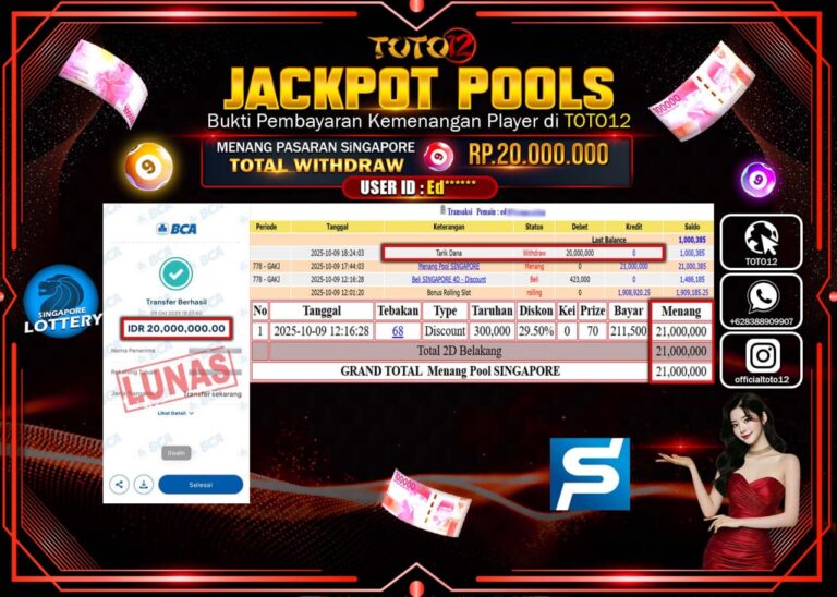 Selamat kepada Member Kami Ed****** Telah Jackpot dan berhasil mendapatkan kemenangan besar pada permainan JACKPOT POOLS PASARAN (SINGAPORE) Dengan Kemenangan Sebesar Rp.20.000.000 –. Setelah mengisi Fomulir Withdraw dengan Kurang waktu 1-2 Menit Dana sudah kami Trasnfer kepada Pemilik Userid dan dana sudah dapat di cairkan oleh pemenang. Bukti Pembayaran yang TOTO12 berikan merupakan Bukti Pembayaran yang …
