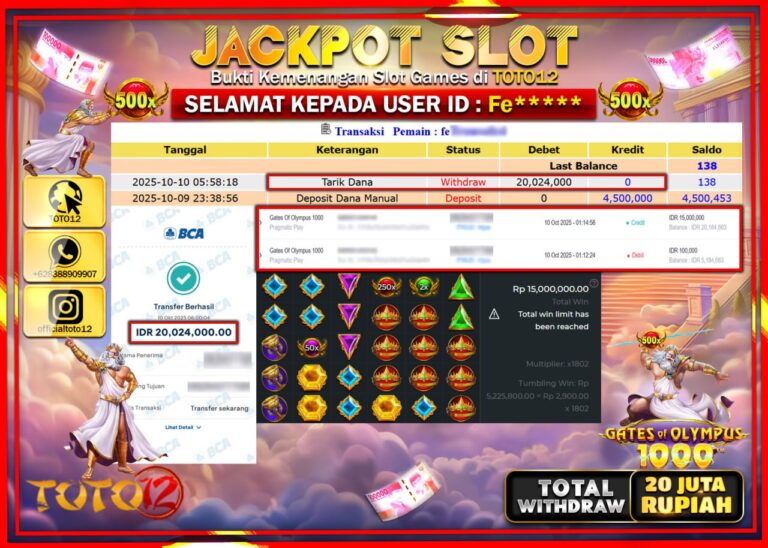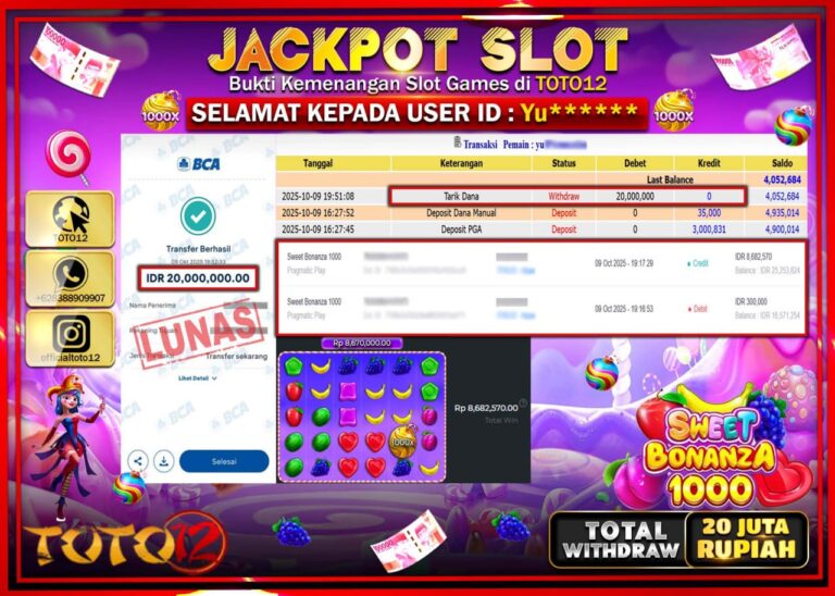 Selamat kepada Member Kami Yu****** Telah Jackpot dan berhasil mendapatkan kemenangan besar pada permainan JACKPOT SLOT GAME (SWEET BONANZA 1000) Dengan Kemenangan Sebesar Rp.20.000.000 –. Setelah mengisi Fomulir Withdraw dengan Kurang waktu 1-2 Menit Dana sudah kami Trasnfer kepada Pemilik Userid dan dana sudah dapat di cairkan oleh pemenang. Bukti Pembayaran yang TOTO12 berikan merupakan Bukti…